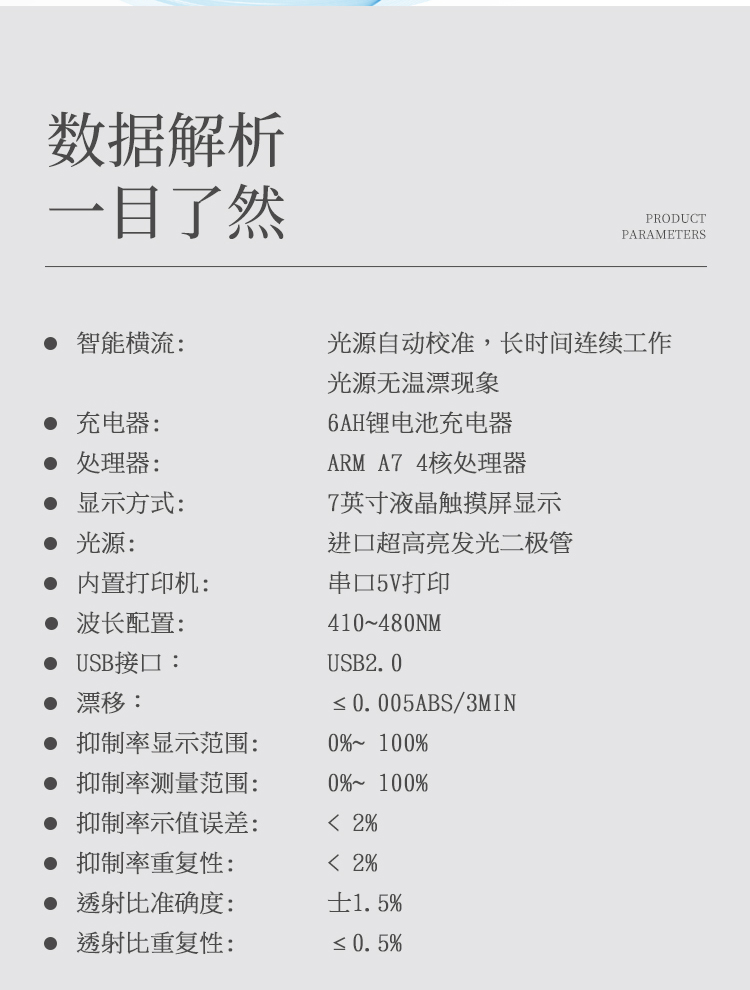 5、智能恒流穩壓,光強自動校準,長時間連續工作光源無溫漂現象。