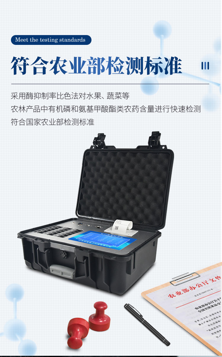 廣泛應用于主要用于蔬菜、水果、茶葉、糧食、農副產品等食品中有機磷和氨基甲酸酯類農藥殘留的快速檢測;此外還可用于果蔬茶生產基地和農貿批發銷售市場現場檢測,餐館、學校、食堂、家庭果蔬加工前的安全速測等。
