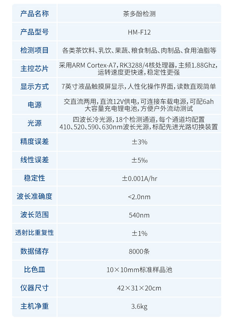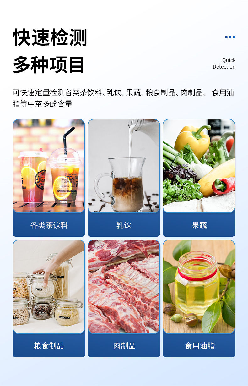 HM-F12茶多酚檢測儀可快速定量檢測各類茶飲料、乳飲、果蔬、糧食制品、肉制品、食用油脂等中茶多酚含量。茶多酚檢測儀可以廣泛應用于產品質量監督檢驗、工商管理、茶葉批發市場、茶葉0.深加工基地、飲料企業、超市、商場、各大食品安全監測系統等部門。