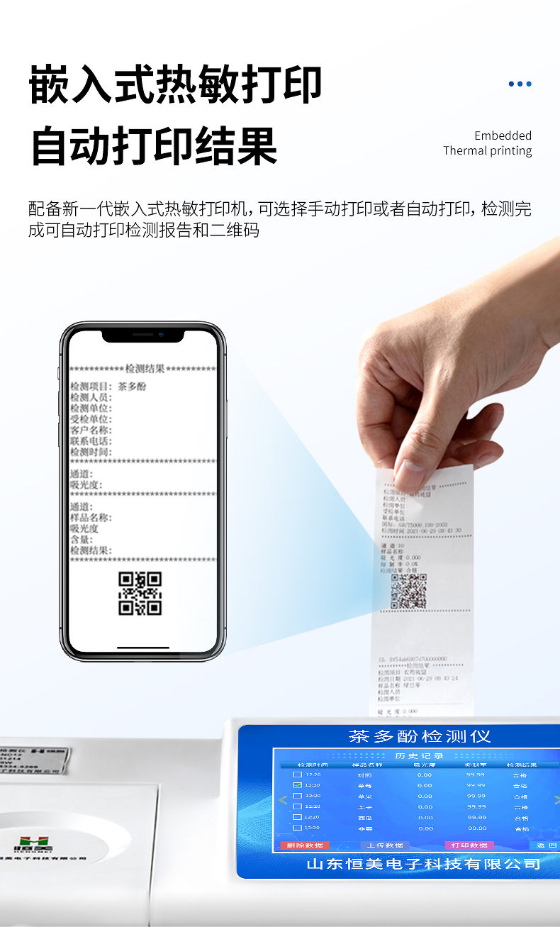 5、配備新一代嵌入式熱敏打印機,可選擇手動打印或者自動打印,檢測完成可自動打印檢測報告和二維碼。