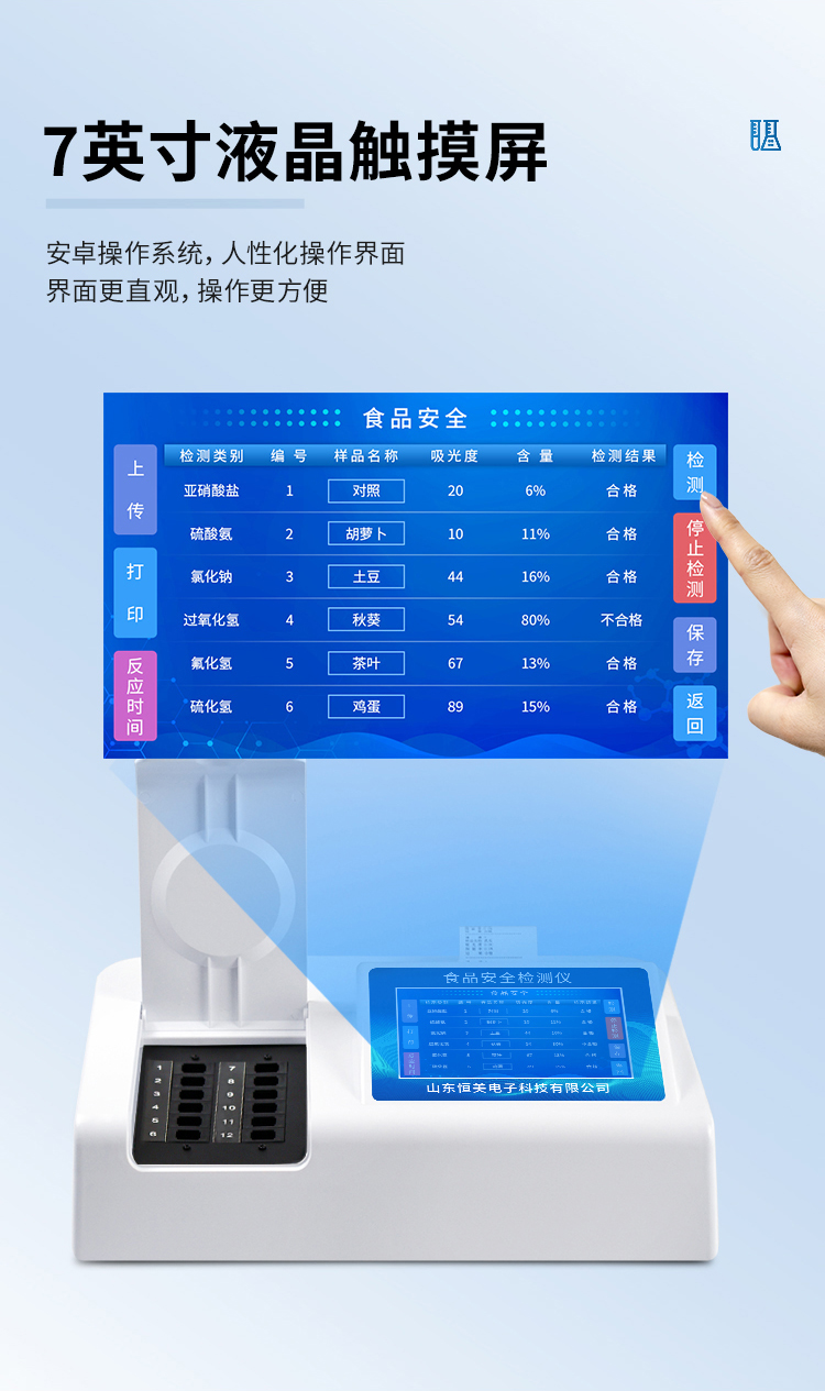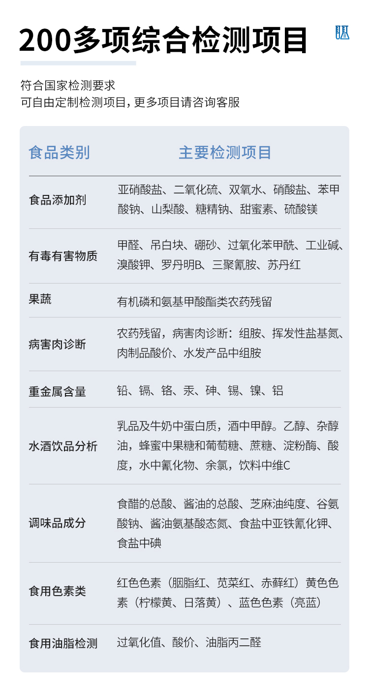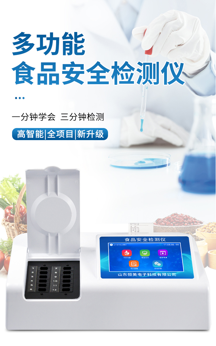 可快速檢測各類食品中的甲醛、吊白塊、二氧化硫、亞硝酸鹽、雙氧水、硼砂、農藥殘留、乳及乳制品中蛋白質、硝酸鹽、重金屬鉛的含量,儀器預留其他項目檢測程序和端口,根據日后需求可方便的自主增加檢測項目。