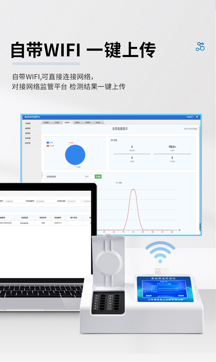 8、儀器帶有監管平臺。數據可局域網和互聯網數據上傳,檢測結果直接傳至食品安全監管平臺。進行區域食品安全監管及大數據分析處理,檢測區域食品安全長短期動態,達到食品安全問題預估、預警