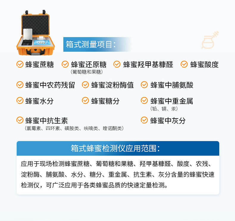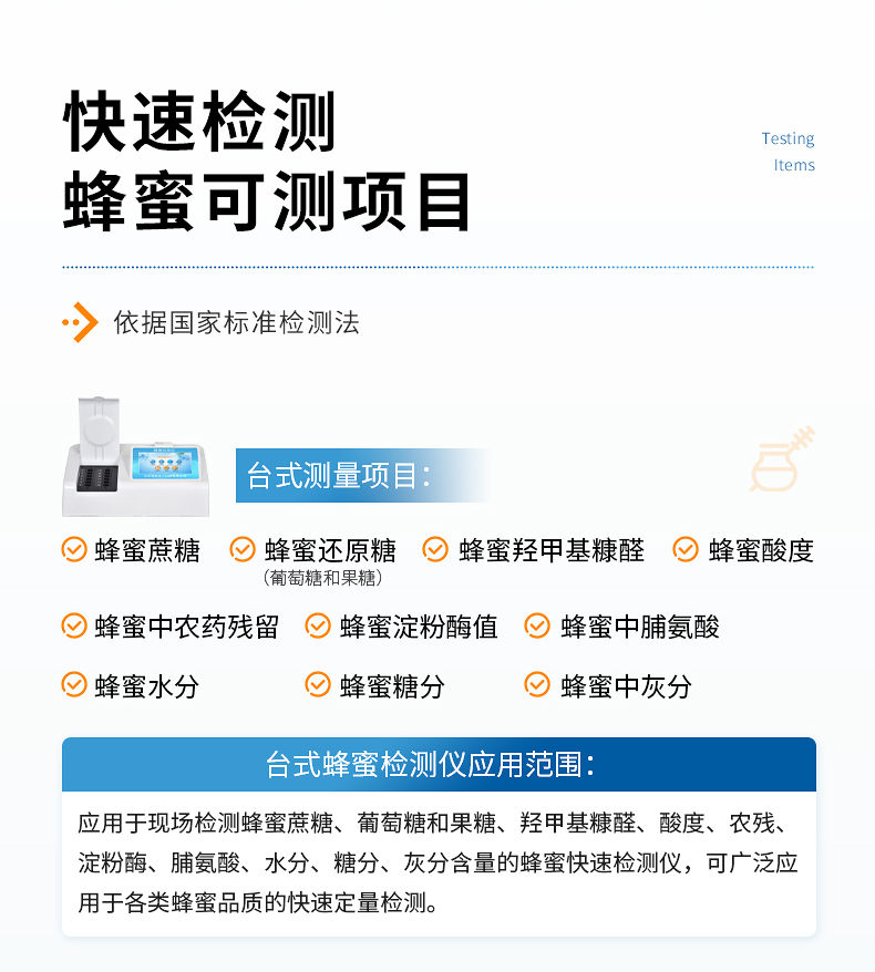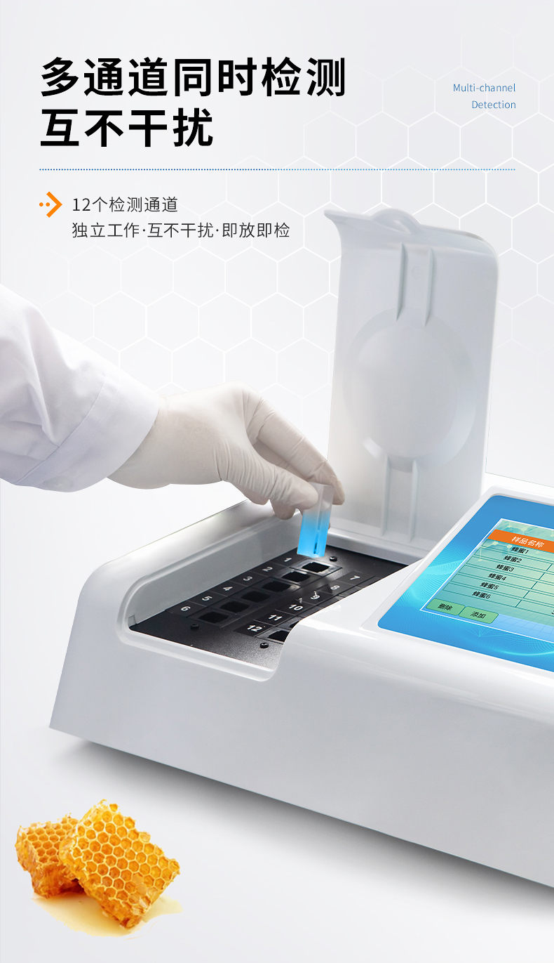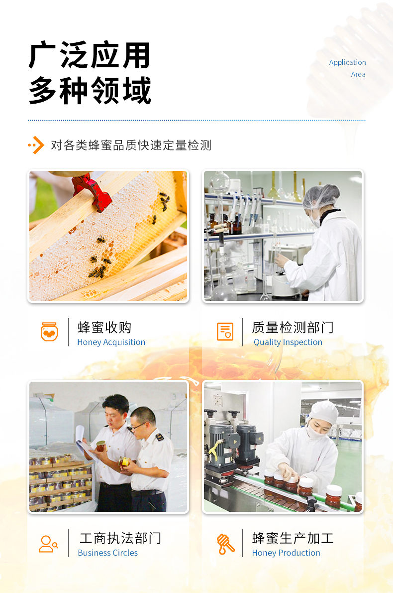 檢測項目:蜂蜜蔗糖、蜂蜜還原糖(葡萄糖和果糖)、蜂蜜羥甲基糠醛、蜂蜜酸度、蜂蜜中農藥殘留、蜂蜜淀粉酶值、蜂蜜中脯氨酸、蜂蜜水分、蜂蜜糖分、蜂蜜中重金屬(鉛、鎘、汞)、蜂蜜中獸藥殘留(氯霉素、四環素、磺胺類、呋喃類、喹諾酮類)、蜂蜜中灰分,應用范圍:應用于現場檢測蜂蜜蔗糖、葡萄糖和果糖、羥甲基糠醛、酸度、農殘、淀粉酶、脯氨酸、水分、糖分、重金屬、獸殘、灰分含量的蜂蜜快速檢測儀,可廣泛應用于各類蜂蜜品質的快速定量檢測。