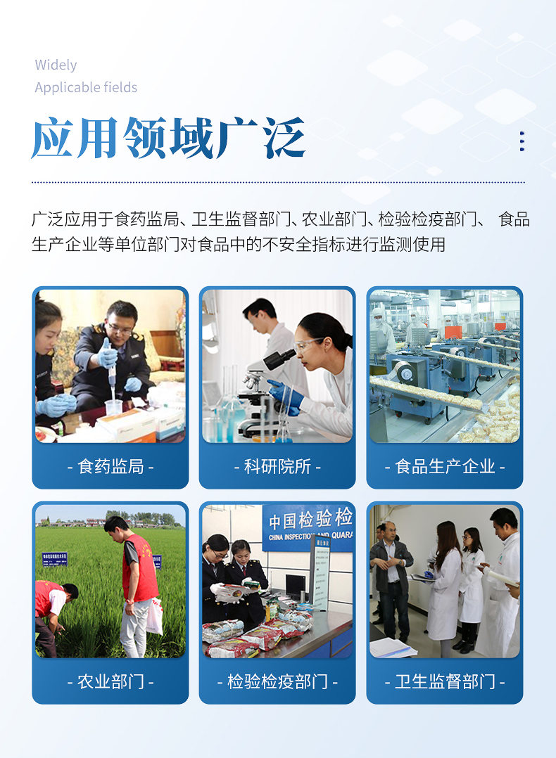 該儀器廣泛應(yīng)用于食藥監(jiān)局、衛(wèi)生監(jiān)督部門、農(nóng)業(yè)部門、檢驗(yàn)檢疫部門、食品生產(chǎn)企業(yè)等單位部門對食品中的不安全指標(biāo)進(jìn)行監(jiān)測使用。