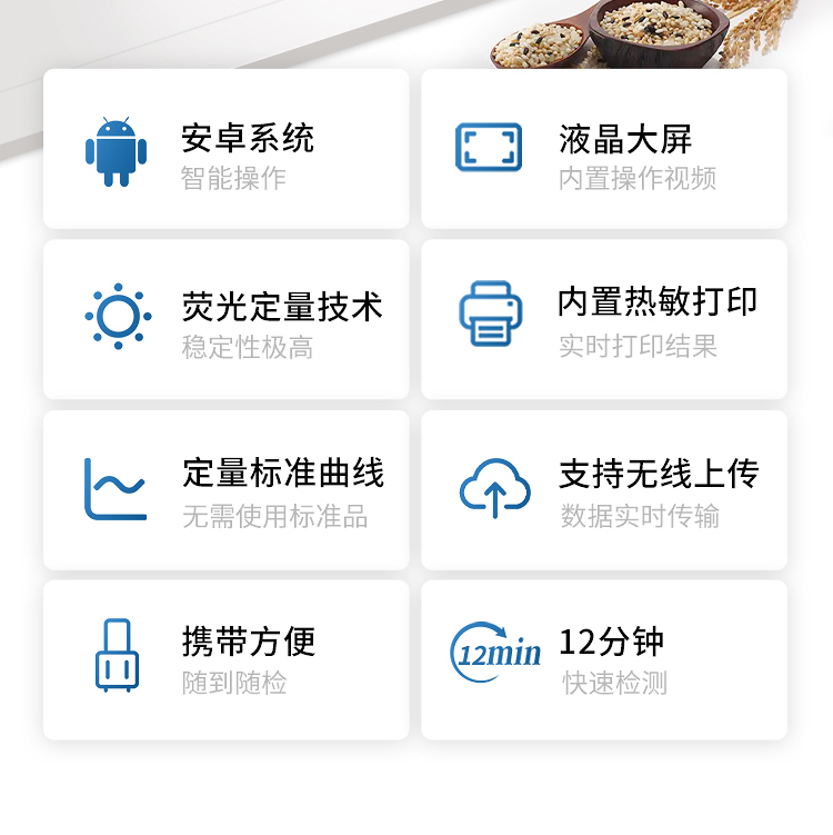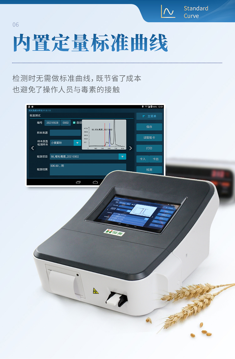 3、內置定量標準曲線:儀器內置標準曲線,無需使用標準品,檢測時無需做標準曲線,既節省了成本,也避免了操作人員與嘔吐毒素的接觸,保護操作人員的安全;