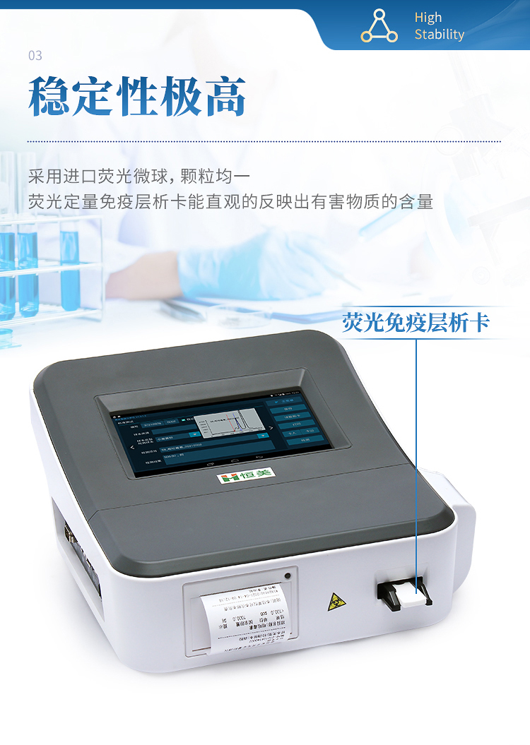 1、穩定性極高:采用進口熒光微球,顆粒均一,從源頭保證產品穩定性好,批次內、批次間重現性好。試劑條可常溫運存,無需冷藏。檢測后,試劑條烘干后可保存一年,實現結果的可追溯性。采用恒溫器裝置,一條一孔,自動計時,不受外界溫濕度影響,適用場地更廣。