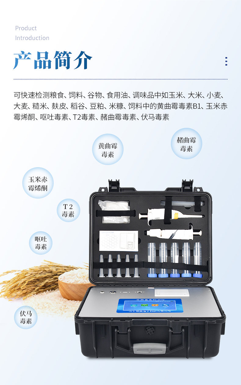 真菌毒素快速檢測儀應用競爭抑制免疫層析的技術原理,通過就是通過待檢測物與抗體結合的方法,分析待檢樣品中真菌毒素殘留。可快速檢測糧食、飼料、谷物、食用油、調味品中如玉米、大米、小麥、大麥、糙米、麩皮、稻谷、豆粕、米糠、飼料中的黃曲霉毒素B1、玉米赤霉烯酮、嘔吐毒素、T2毒素、赭曲霉毒素、伏馬毒素。
