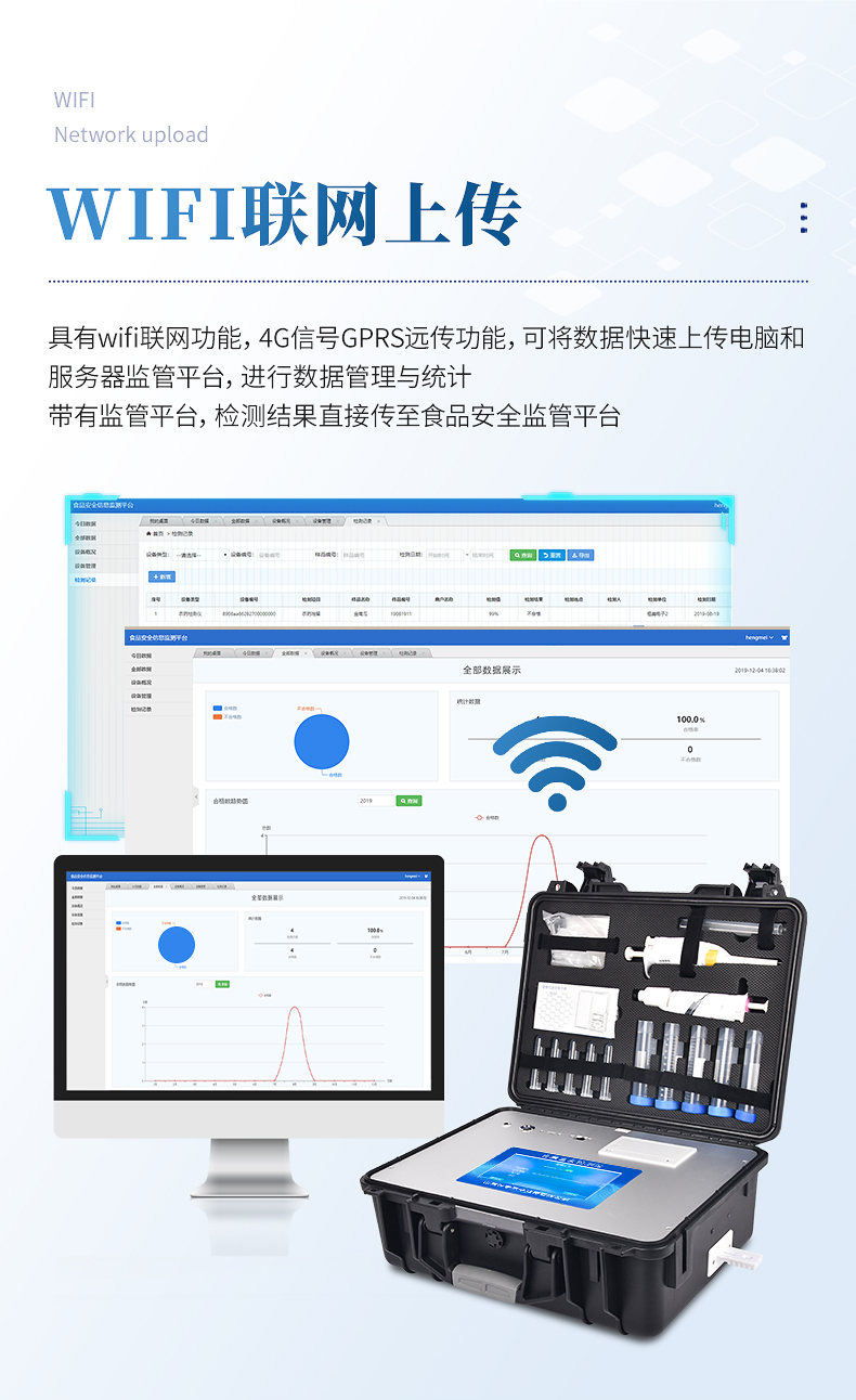 6、儀器具有wifi聯網功能,4G信號GPRS遠傳功能,可插手機卡實現數據遠傳,可將數據快速上傳電腦和服務器監管平臺,進行數據管理與統計。