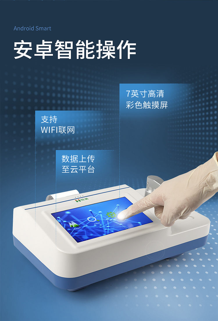 1、安卓智能操作系統(tǒng),儀器可通過WiFi聯(lián)網,將數(shù)據(jù)上傳至云平臺;