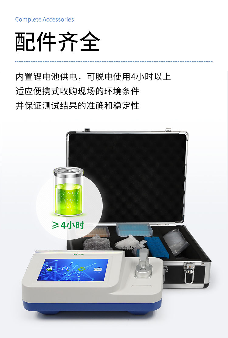 9、內置鋰電池供電,交直流兩用,可脫電使用4小時以上,適應便攜式收購現(xiàn)場的環(huán)境條件并保證測試結果的準確和穩(wěn)定性;