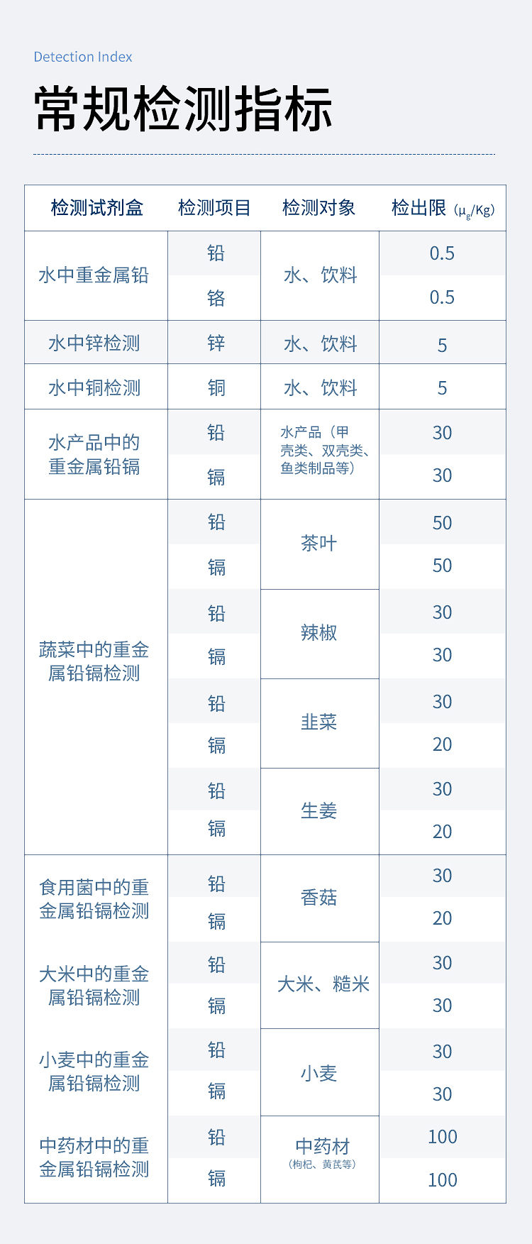 | 序號 | 檢測試劑盒 | 檢測項目 | 檢測對象 | 檢出限 (μg/kg) |