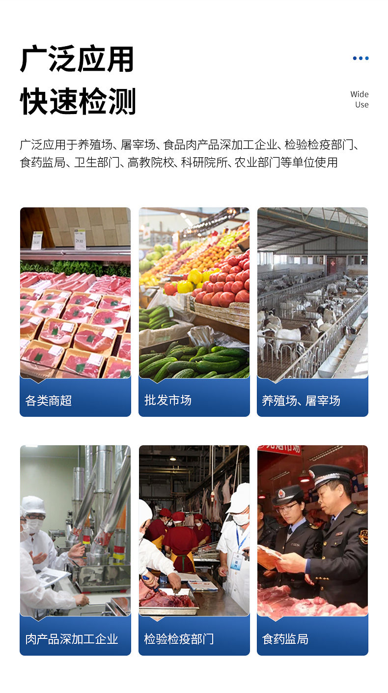該肉制品檢測儀為集成化肉品安全快速檢測分析設備,廣泛應用于養殖場、屠宰場、食品肉產品深加工企業、檢驗檢疫部門、食藥監局、衛生部門、高教院校、科研院所、農業部門等單位使用。