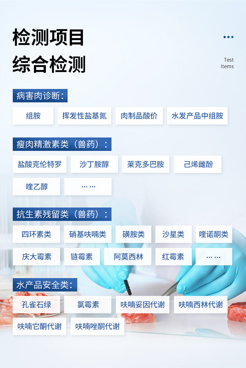 肉制品檢測儀可快速檢測幾十種項目,包含各種獸藥殘留:抗生素類殘留、瘦肉精激素類殘留;病害肉診斷:肉類新鮮度、肉中組胺、揮發性鹽基氮;水產品安全篩查等現場的定性定量檢測。