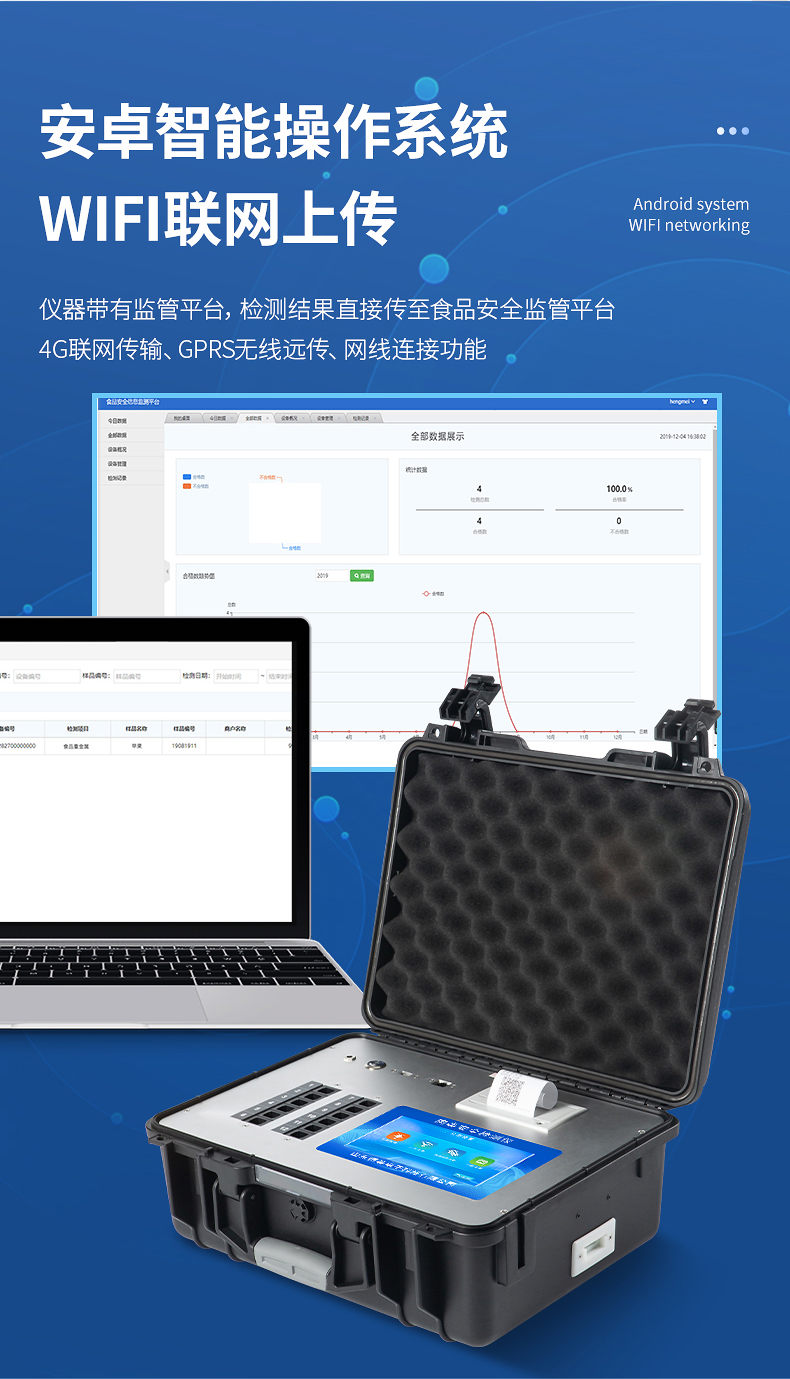4、儀器帶有監管平臺,數據可局域網和互聯網數據上傳,檢測結果直接傳至食品安全監管平臺。進行區域食品安全監管及大數據分析處理與數據統計,檢測區域食品安全長短期動態,達到食品安全問題預估、預警