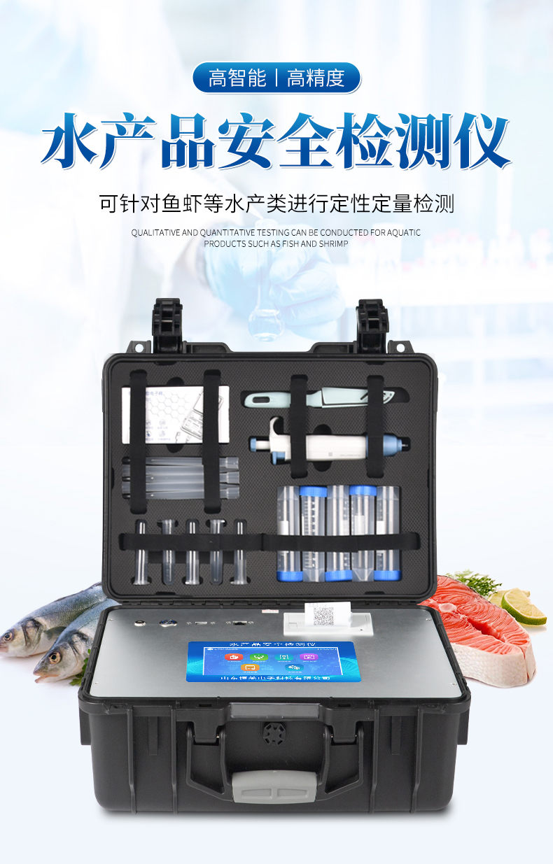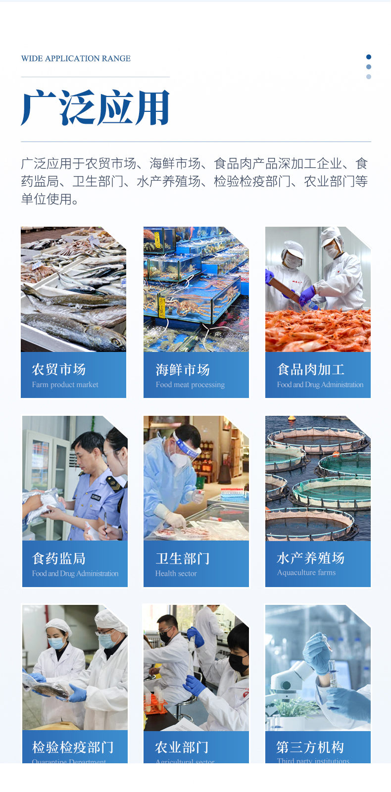 水產品檢測儀可快速檢測魚、蝦等水產類中的氯霉素、孔雀石綠、四環素類、硝基呋喃類、磺胺類、喹諾酮沙星類、氟苯尼考、土霉素、金霉素、甲砜霉素、地西泮等快速檢測,如氯霉素快速檢測卡整個檢測過程只需要30分鐘左右, 靈敏度為 0.3 μg/kg (ppb)。該快速檢測系統設備為集成化食品安全快速檢測分析設備,廣泛應用于農貿市場、海鮮市場、食品肉產品深加工企業、食藥監局、衛生部門、水產養殖場、檢驗檢疫部門、農業部門、第三方機構等單位使用。