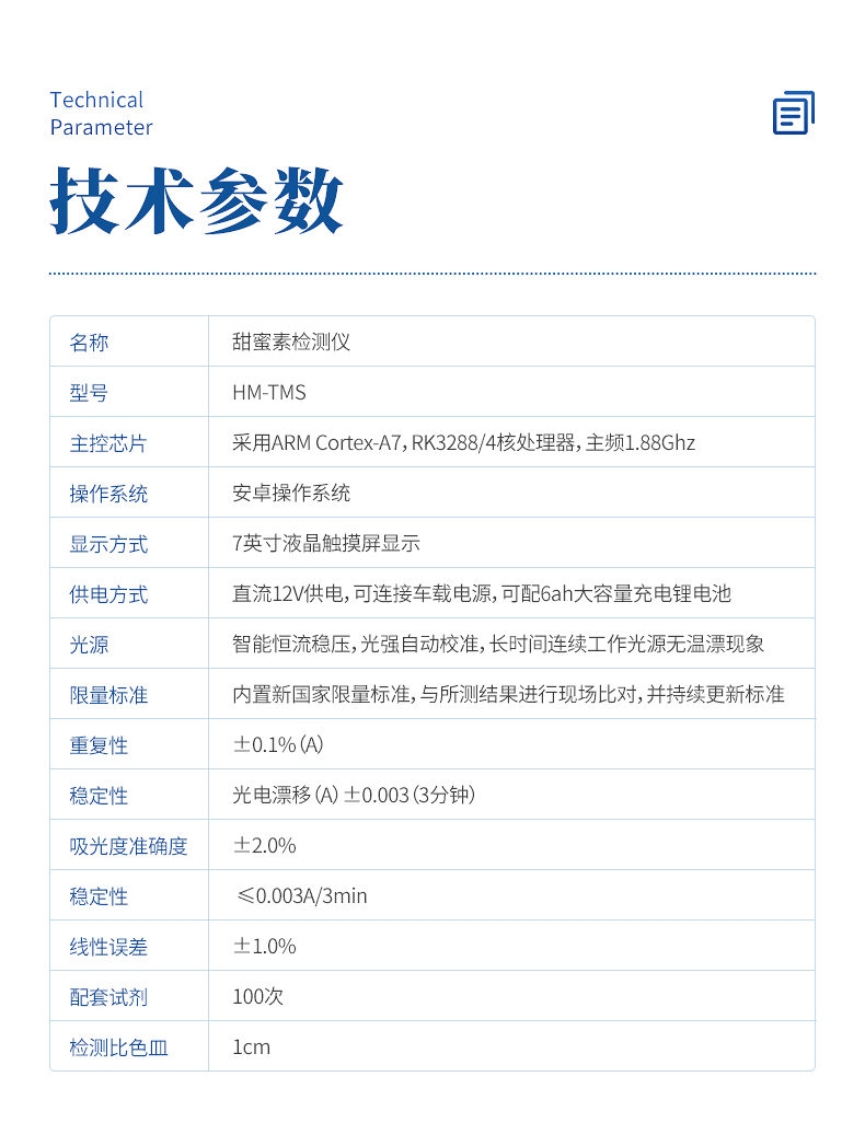 該檢測儀通過測量特定波長下溶液對光的吸收程度來確定甜蜜素的濃度。甜蜜素在水溶液中與特定試劑反應(yīng)后,會形成一種在可見光或紫外光區(qū)域有明顯吸收峰的復(fù)合物。當(dāng)用適當(dāng)波長的光照射這種溶液時,根據(jù)朗伯-比爾定律(Lambert-Beer Law),吸光度與溶液中甜蜜素的濃度成正比關(guān)系。
