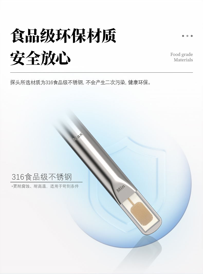 ■沒有二次污染 探頭所選材質均為食品級環保材質,不會產生二次污染。