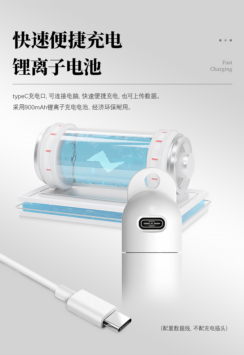 ■便攜性采用900mAh鋰離子充電電池,經濟環保耐用,TYPE-C充電口快速便捷。