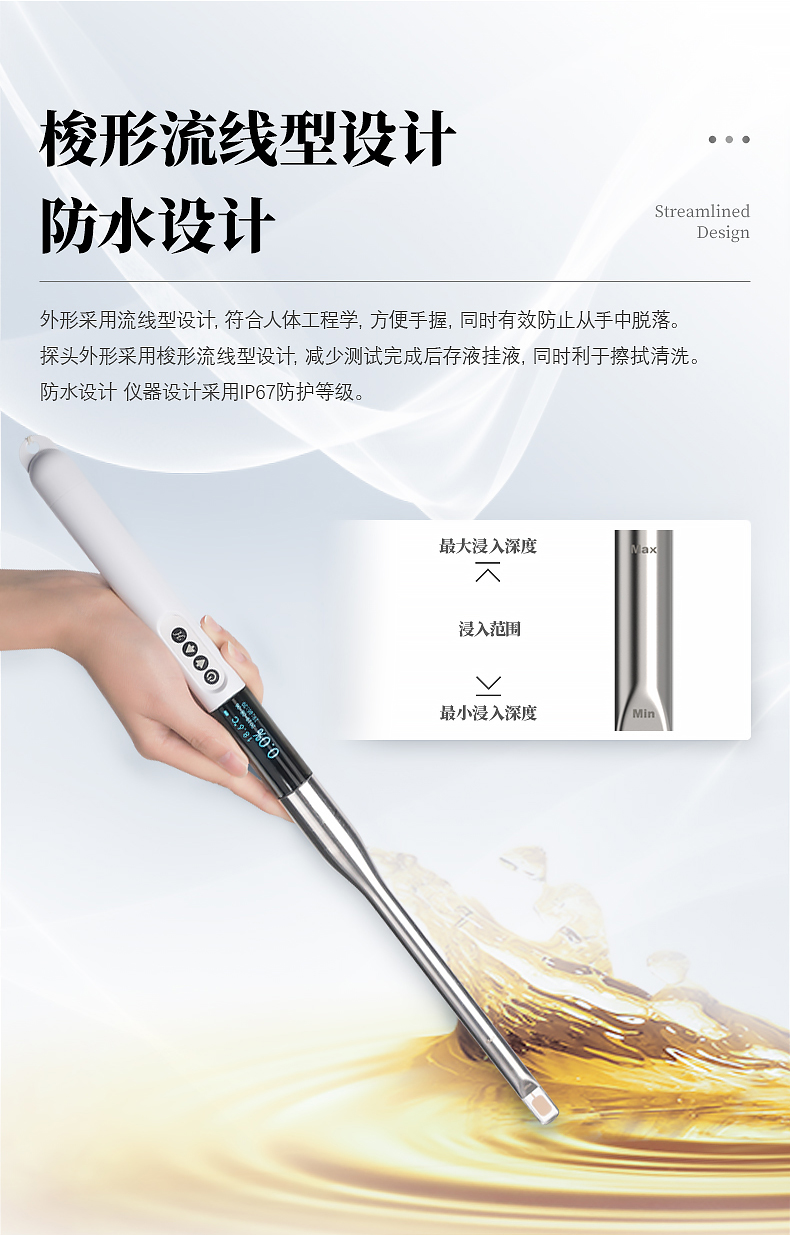 ■探頭外形采用梭形流線型設計,減少測試完成后存液掛液,同時利于擦拭清洗。