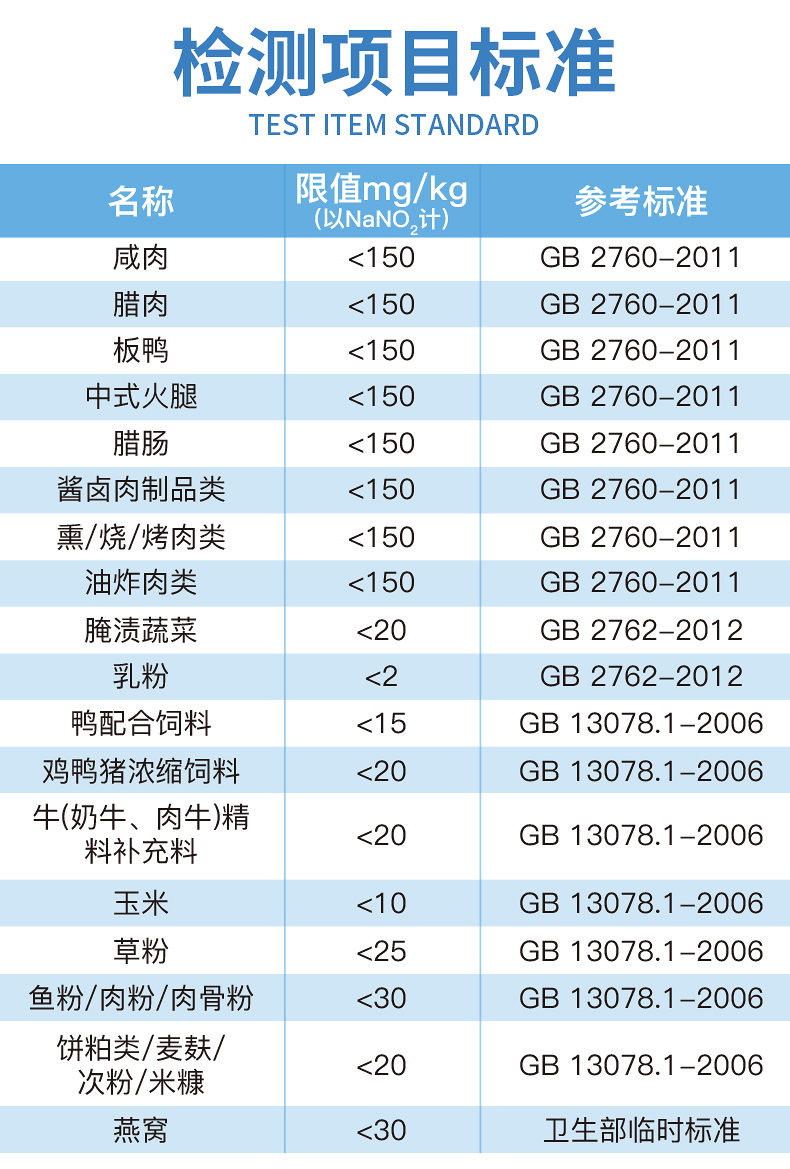 1、亞硝酸鹽檢測下限:1mg/kg
