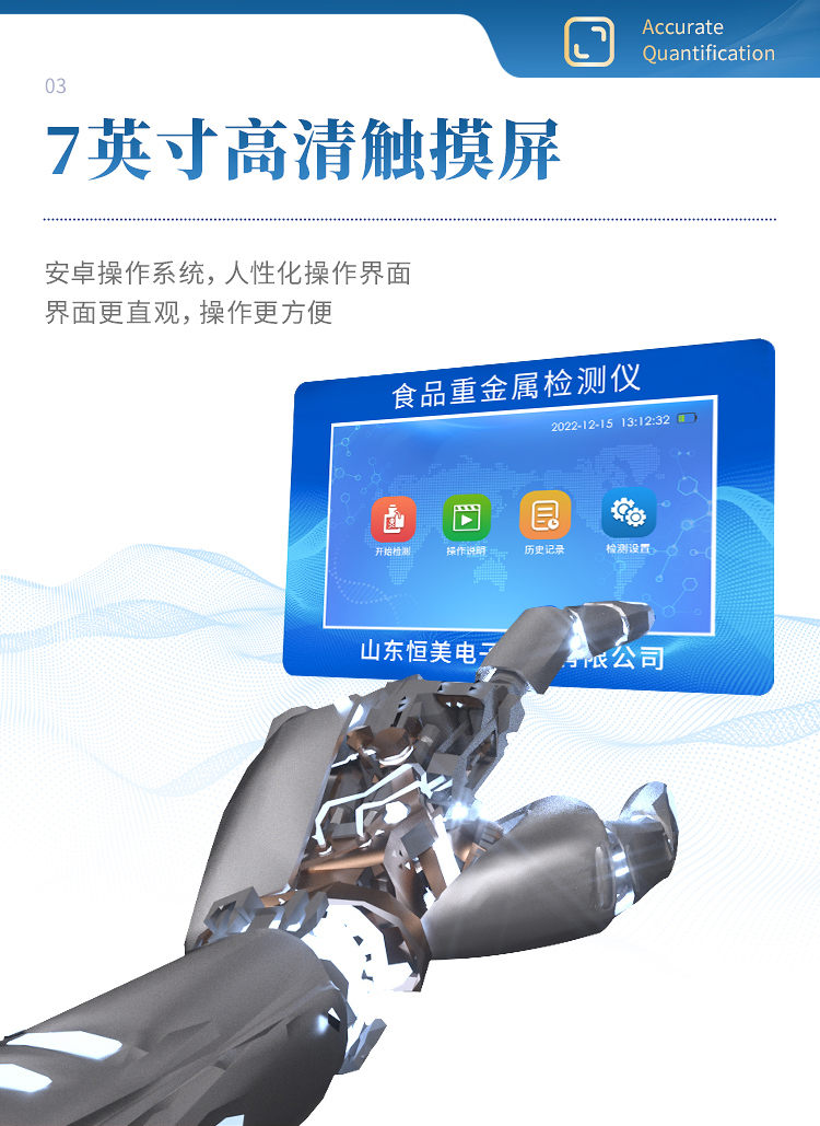 HM-TZ05重金屬檢測(cè)儀可廣泛應(yīng)用于大米、糧谷、果品、蔬菜、藥材、水質(zhì)、水產(chǎn)品中重金屬鉛、鎘、六價(jià)鉻、汞、砷、鐵、鎳、鋁(任選5項(xiàng))的快速檢測(cè),檢測(cè)項(xiàng)目可根據(jù)客戶的需求定制。